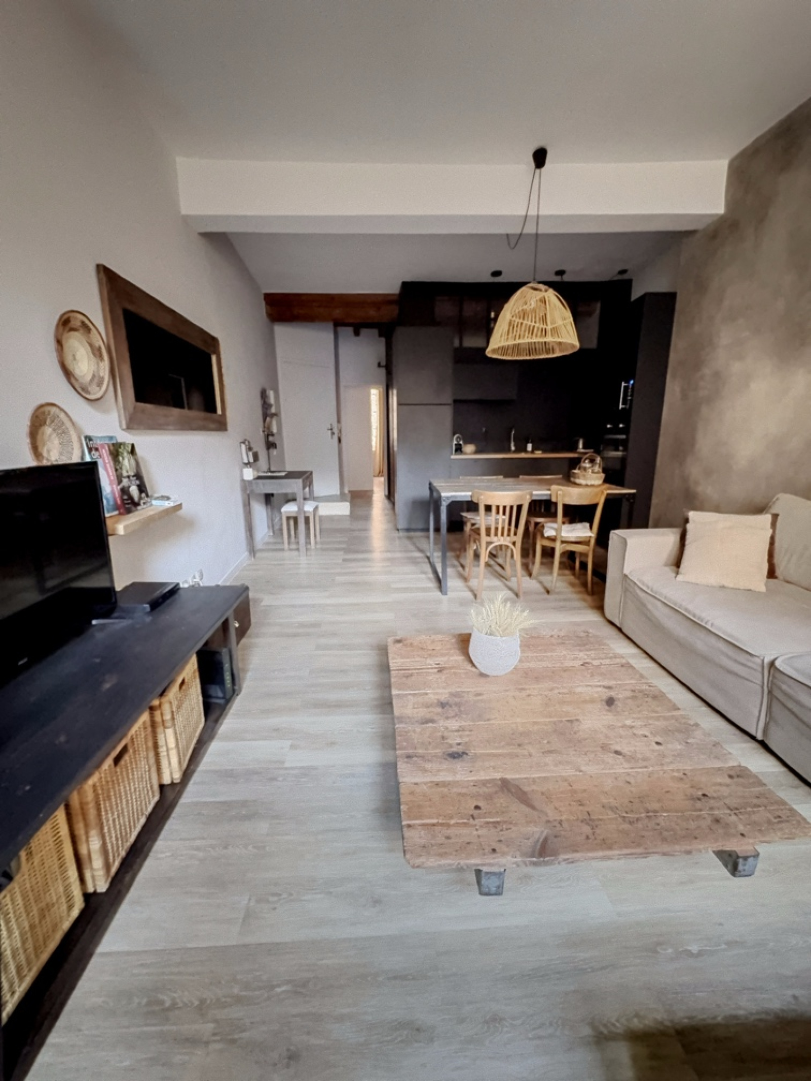 Un beau hall d’entrée mène à une cuisine entièrement équipée, ouverte sur un salon/séjour convivial.